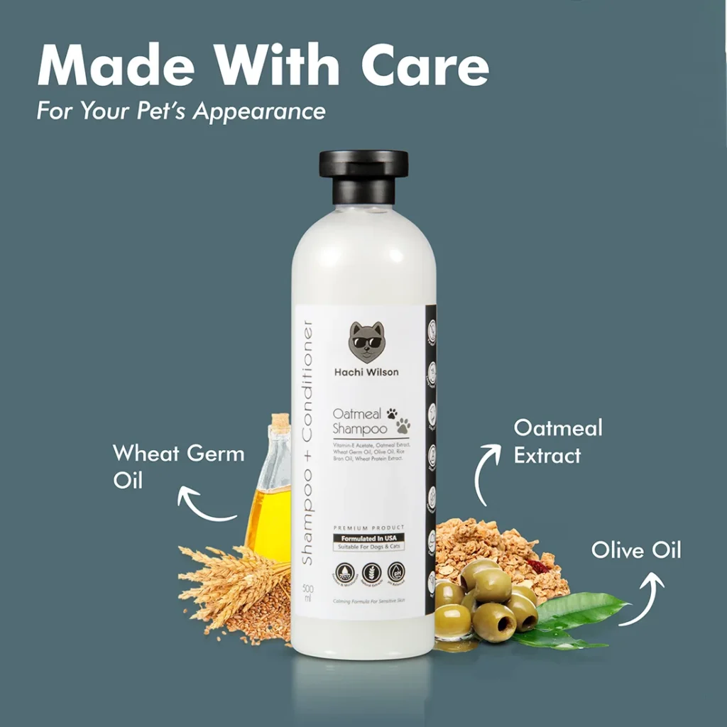 Hachi Wilson Premium Dog Shampoo is a USA-formulated, USFDA-approved product made with 100% natural ingredients. It works as a shampoo, conditioner, and deodorizer, providing deep nourishment, detangling, and a refreshing fragrance.